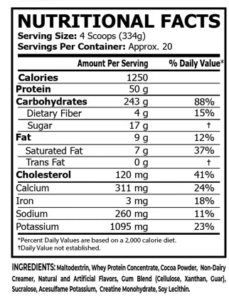 CORE CHAMPS MASS Gainer is made with 100% whey protein that delivers a massive 1250 calories when mixed with 18-20 oz. of water. CORE CHAMPS MASS Gainer contains 50-gram high-quality protein, quickly digested carbohydrates, and other minerals. This advanced mass gainer has been designed for any individual who has a tough time adding size, is in their bulking phase, or wants to break through their strength plateaus.