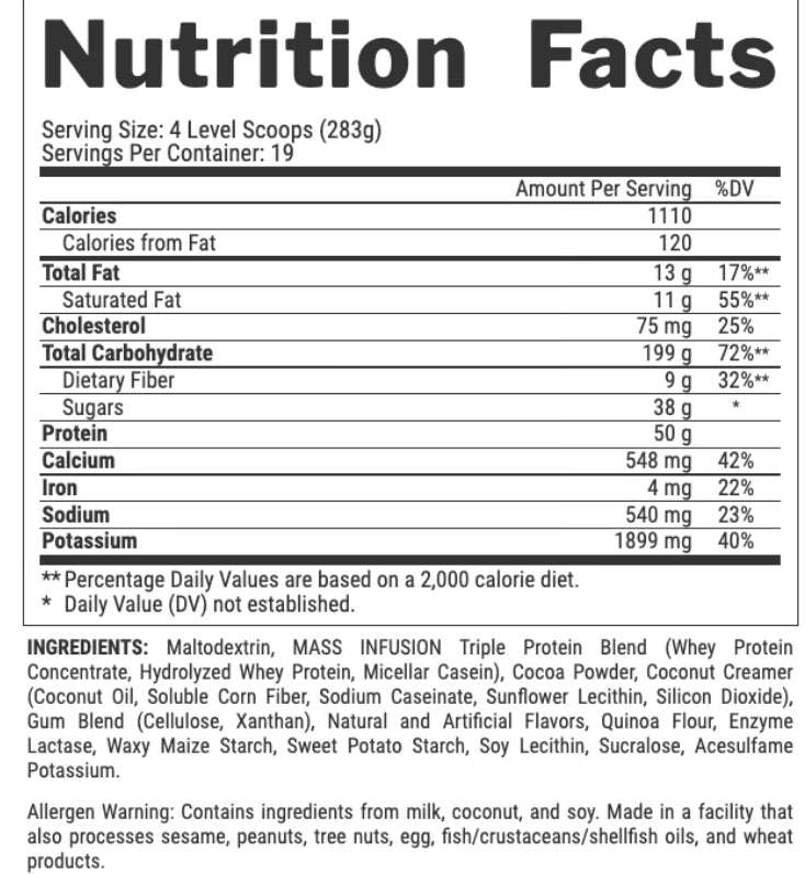 Muscle Rulz Gain Rulz formula made with pure and high-quality protein isolate, whey protein concentrate, and pure cocoa powder. This mass gainer is loaded with 50 g protein, 1250calories, and 243 g carbohydrates. It’s also a significant source of calcium, iron, potassium, fiber, sodium, and sugars to fuel your bulked-up physique.