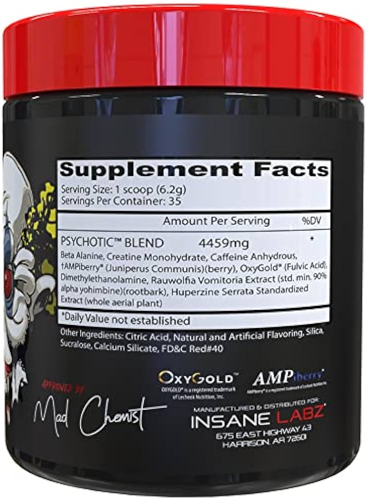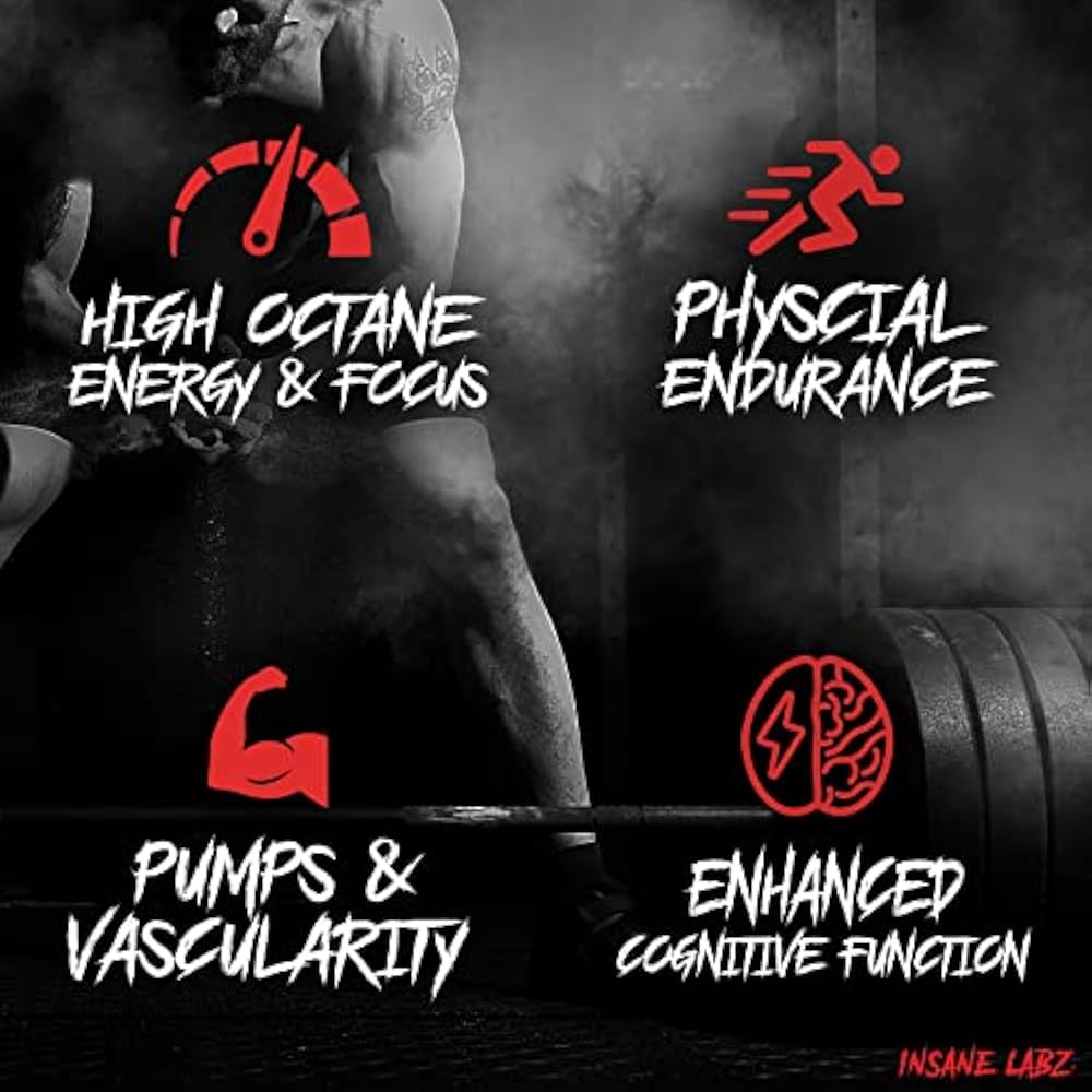 ENERGY; FOCUS; ENDURANCE; STRENGTH; If having a substantial energy and strength boost that keeps going long after your workout has ended, Insane Labz PSYCHOTIC is the only choice; Loaded with Beta-Alanine, Creatine Monohydrate and DMAE to boost endurance and focus to get you through the toughest workouts